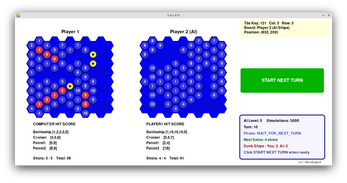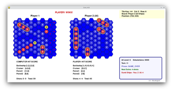 Except for the hex grid map, this battleship game is a faithful rendition of a pen-and-paper battleship game that appeared in Hoyle's Rules of the Game. Unlike many table-top and digital battleship games in which you fire one shot per turn and gets to know immediately if it hits or not, in Salvo, each turn, you get to fire a maximum volley of 7 shots, 3 for the battleship, 2 for the cruiser and 1 for each patrol boat. You are only informed how many of your salvos hit a particular ship. You do not know which shots actually hit. Salvo markers are numbered based on the game turn they were fired. Any hits will be marked on your scoreboard. If you hit the enemy's battleship twice on turn1, and once on turn2, you scoreboard will look like this: "Battleship [ 1. 1. 2. 0, 0 ]." The scoreboard will tell you how many times you hit enemy ships and on which turn, but it does not tell you which section of the ship is hit. Based on the score pattern, you will be able to deduce the location and direction of your targets. However, as your enemy sinks your ships, your total salvo points gets deducted. If you have only the cruiser left, you only get to fire 2 salvos. The player with at least 1 salvo point left at the start of the turn WINS the battle.